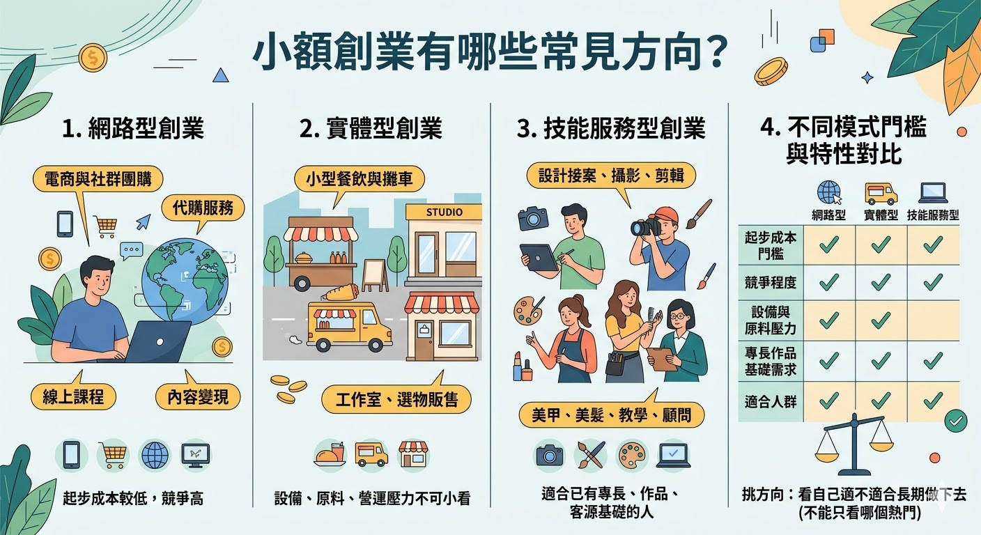 小額創業的方向很多,常見可以分成三類。第一類是網路型,例如電商、社群團購、內容變現、代購與線上課程。第二類是實體型,例如小型餐飲、攤車、工作室、選物販售。第三類則是技能服務型,例如設計接案、攝影、剪輯、教學、美甲、美髮、顧問服務等。